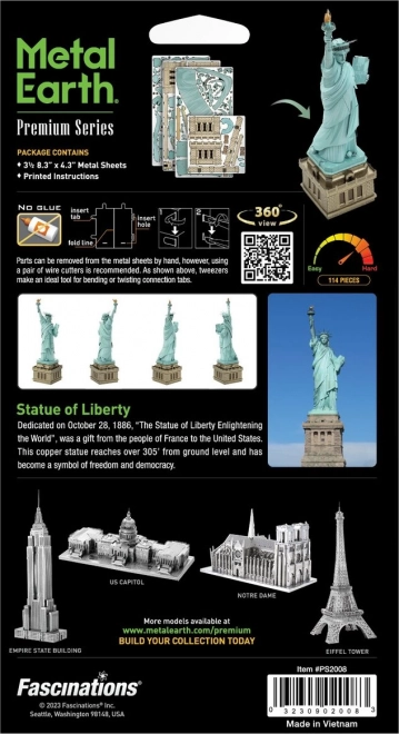 Byg din egen miniature af den ikoniske Frihedsgudinde af præcist indgraverede metalplader. 3D-puslespillet fra Premium Series byder på detaljeret lasergravering, et imponerende færdigt modelresultat og en underholdende, tålmodighedsudviklende byggeproces. Ideelt som stilfuld dekoration og original gave til elskere af arkitektur og modelbygning.