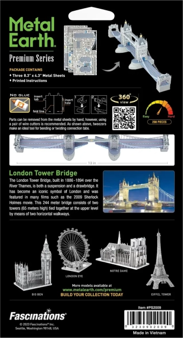Det præmie‑metal-3D-puslesæt METAL EARTH gengiver TOWER BRIDGE troværdigt med de karakteristiske tårne og klapbroer. Takket være lasergravering træder realistiske teksturer og arkitektoniske elementer frem, hvilket gør modellen til et iøjnefaldende stykke på hylden eller i vitrinen.