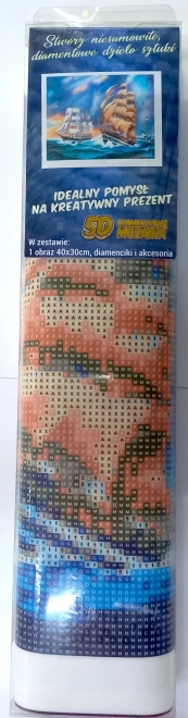 Diamantmaling – fremgangsmåde: Oversiden af lærredet er dækket med lim og beskyttet af en gennemsigtig folie. Fjern folien gradvist i takt med, at du påfører stenene. Lærredet har symboler angivet i den vedlagte legendeseddel, som henviser til den relevante pose med sten markeret med et nummer. Hæld stenene fra den valgte pose i skålen. Tag voks i pennens spids, så stenene nemt fæstner sig til pennen. Påfør stenene på motivet med pennen, hæld derefter overskydende sten tilbage i posen og fortsæt med den næste farve.