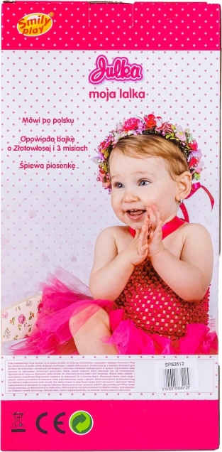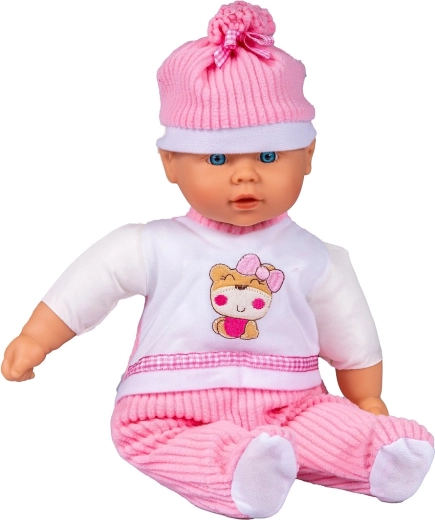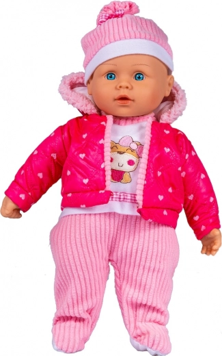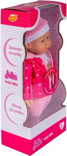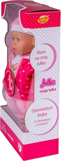 Dukken Julka elsker, når du passer på hende og går ture med hende. Den bløde dukke er klædt i hue, halstørklæde, heldragt med stribede bukser og en lyserød quiltet jakke med hætte, kantet med stribet stof i buksernes farve.