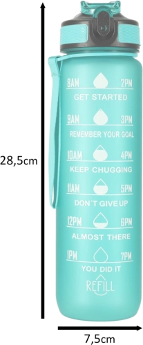 Farvel til engangsflasker – denne genanvendelige flaske i Tritan byder på lav vægt, høj holdbarhed og et look, der minder om glas. Takket være motiverende tekster og tidsmarkeringer har du styr på væskeindtaget hele dagen på arbejde, i skolen og til træning.