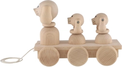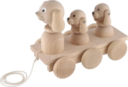 Det søde træk-legetøj i træ vil glæde ethvert lille barn. Når det kører, bevæger de tre hunde sig nuttet, hvilket støtter de første skridt og udvikler motorik og koordination. Kvalitetsnaturtræ og glat finish sikrer sikker og sjov leg.
