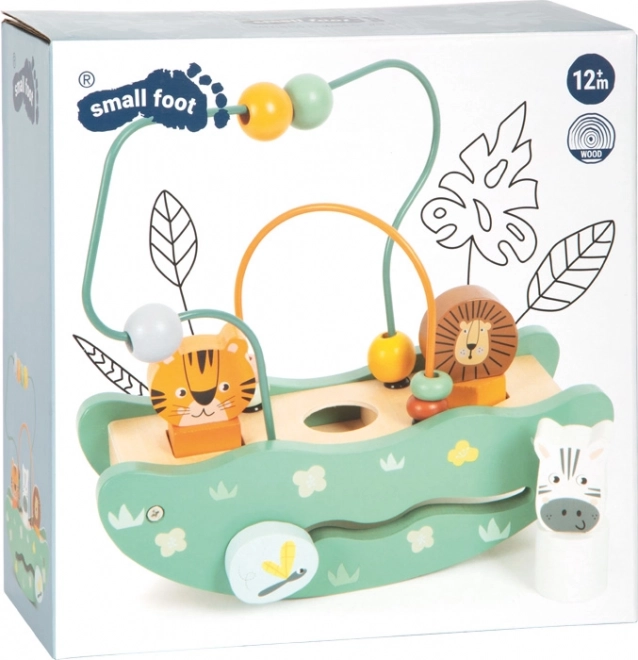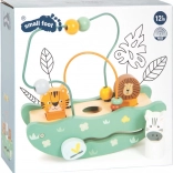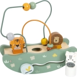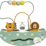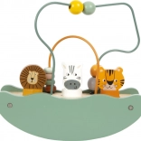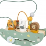 Trælegetøjet med safari-tema indeholder farverige perler og dyrefigurer af løve, tiger og zebra til legende læring.