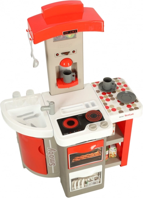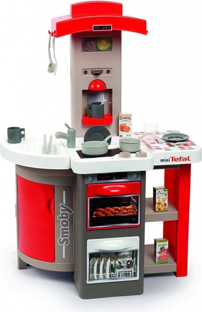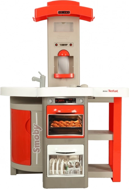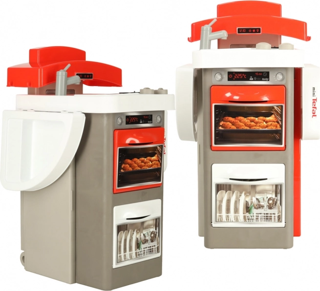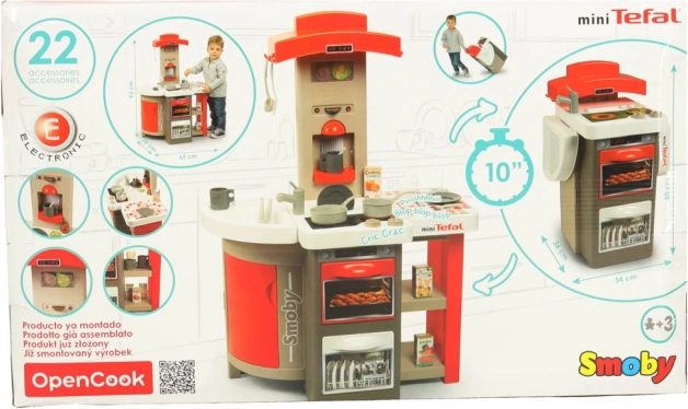 Elektronisk legekøkken SMOBY MINI TEFAL OpenCook i moderne farver tilbyder lys- og lydeffekter, sammenklappelig konstruktion og hjul for nem transport. Inklusive vask med vandhane, kogeplader med kogeeffekt, ovn, opvaskemaskine, køleskab og integreret kapselkaffemaskine. Perfekt til at udvikle fantasi, finmotorik og til fælles leg.