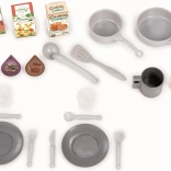 Køkkenet omfatter vask med vandhane, ovn, opvaskemaskine, køleskab med åbningsbare døre og en kapselkaffemaskine med plads til opbevaring. Inkluderer 22–23 dele tilbehør (gryder, tallerkener, bestik, kopper, glas, kapsler, køkkenredskaber, madvarer). Takket være hjulene og den smarte sammenklappelige konstruktion kan det efter legen nemt flyttes og opbevares.