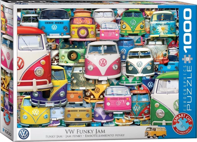 Oplev en opslugende udfordring: EUROGRAPHICS-puslespillet med motivet Volkswagen Bus: Funky Jam byder på en detaljeret illustration og utraditionelle brikformer, der bryder det standardiserede gitter. Hver brik passer præcist, men de usædvanlige former øger spændingen og glæden ved hvert korrekt match.