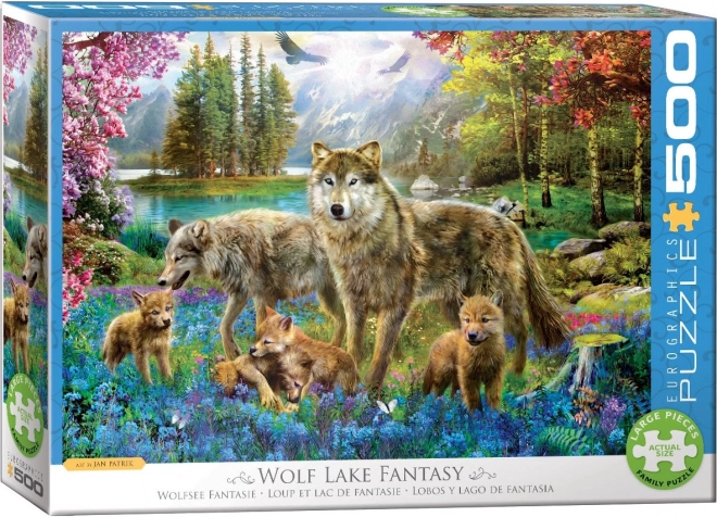 Nyd afslappet puslespilslægning med EUROGRAPHICS-puslespillet med motiv af en ulvefamilie ved søen. Brikkerne er ekstra store (ca. 2,5 cm), så de er perfekte til børn, seniorer og alle, der foretrækker nem håndtering og højere komfort under lægningen. Det færdige billede måler ca. 67,63 × 48,89 cm.