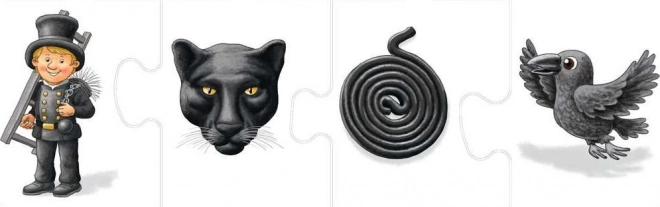Hvert mini-puslespil repræsenterer én farve med tematiske billeder, som børn nemt kan huske og navngive.