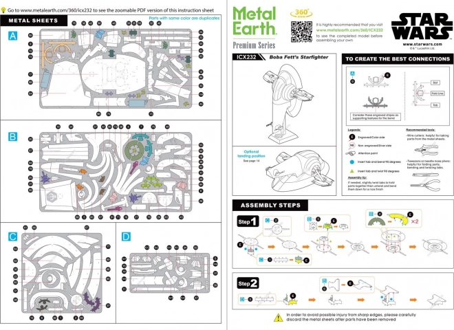 Den premiumserie METAL EARTH ICONX leverer større og mere detaljerede modeller til fans af modelbygning og Star Wars. Boba Fett Starfighter skiller sig ud med autentiske detaljer og realistisk udseende takket være præcis lasergravering. Af flade stålplader opstår der en tredimensionel samlergenstand uden behov for lim.
