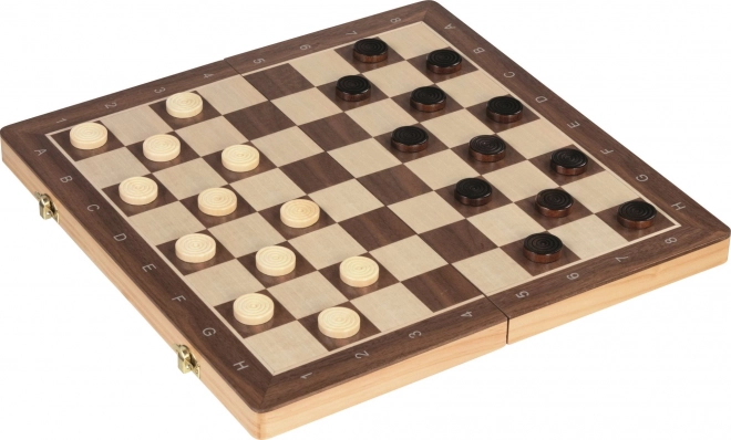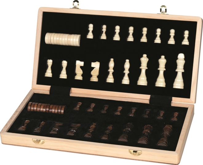 Det praktiske træbræt foldes til en kompakt kuffert med spænder, hvor alle brikker opbevares sikkert indvendigt.