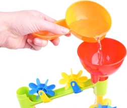 Hæld vand direkte i den øverste tragt – strømmen løber ned ad banerne og sætter alle de farvede møller i gang.