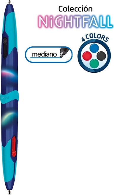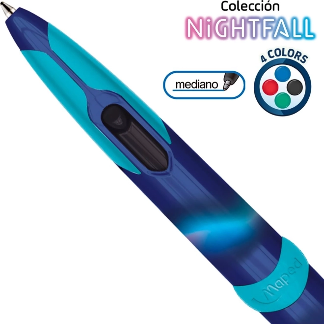 Stilfuld dobbeltsidet kuglepen Maped Twin Tip 4 Nightfall tilbyder 4 farver i én med sideplaceret trykmekanisme, ergonomisk blødt greb helt ud til spidsen og et moderne metalisk design. Ideel til skrivning, fremhævning og organisering af noter.