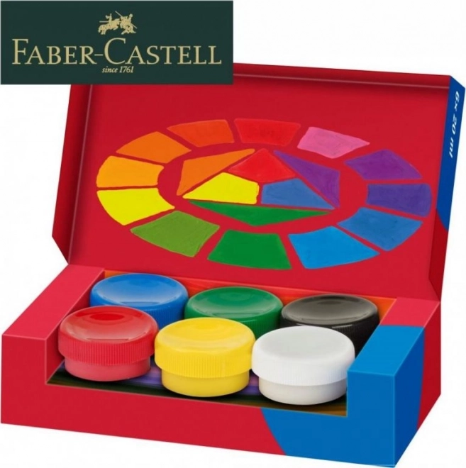 Sæt med temperafarver fra Faber-Castell indeholder 6 intensivt pigmenterede farver, ideel til forskellige overflader, arrangeret i praktiske beholdere med skruelåg.