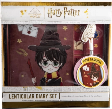 Fortryl både små og store HARRY POTTER-fans med et stilfuldt skrivesæt, der forvandler enhver note til en magisk oplevelse. Den lentikulære forside på dagbogen skifter motiv efter betragtningsvinkel, så man aldrig bliver træt af at kigge på den. Praktiske tilbehør som tematiske klistermærker, sticky notes og en pen med Hedvig vil glæde alle, der elsker troldmandsverdenen.