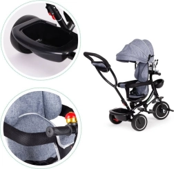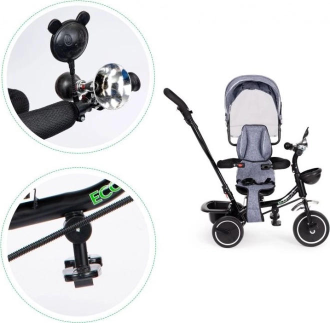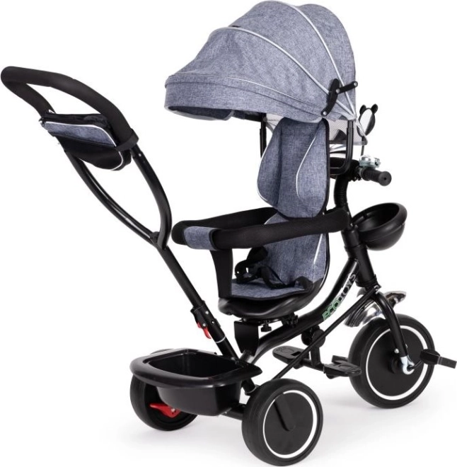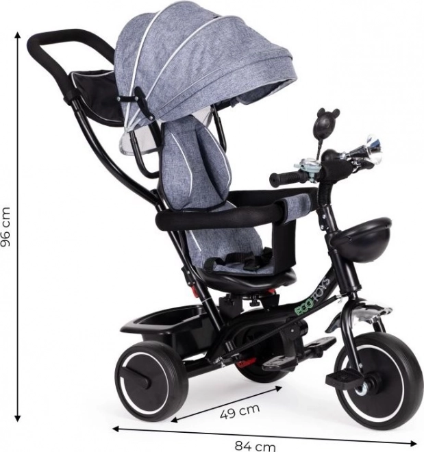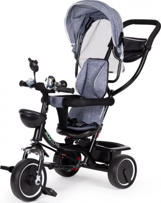 Trehjulet cykel ECOTOYS sikrer komfort med blød rygstøtte og sikkerhedsseler. Den aftagelige kaleche beskytter mod sol og regn.
