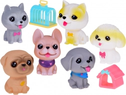 Hver hund afgiver en sjov pivelyd og har en lille åbning i bunden. Sættet inkluderer forskellige racer som bulldog, shiba inu, puddel, weimaraner, mops og korthåret chihuahua, hver med deres egne yndige tilbehør. Derudover inkluderer det et mini hytte og en transportkasse.