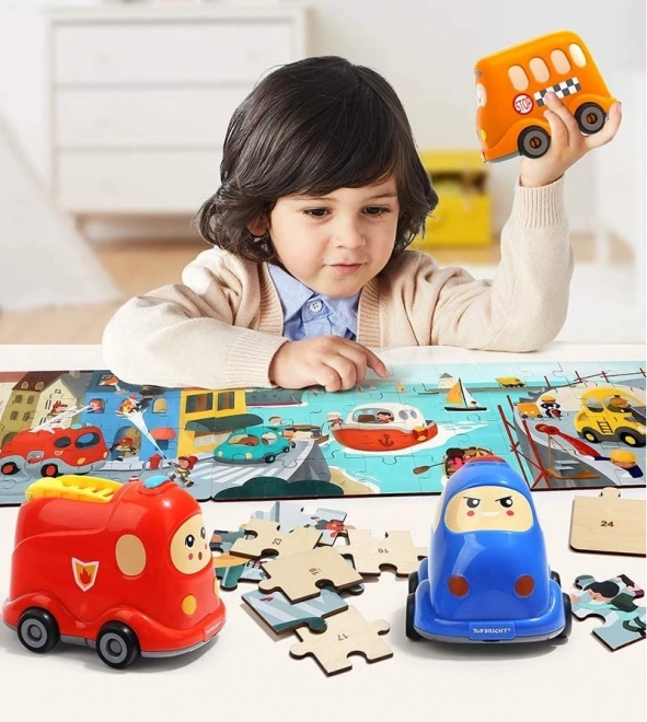 Bilen har et åbningslåg på undersiden, hvor børn kan lægge puslespillet eller små skatte. Hvis du køber flere motiver fra mini-serien (politibil, skolebus, bulldozer, helikopter, båd), passer billedkanterne sammen og skaber et fængende panoramapuslespil med transporttema.