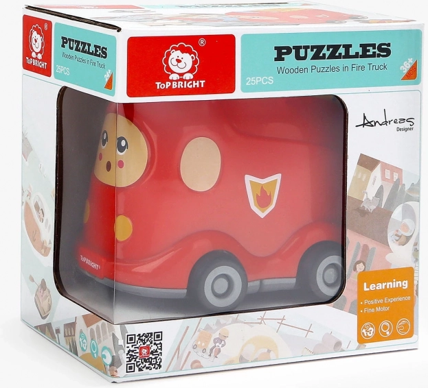 Praktisk kombination af træpuslespil og brandbil i plast med hjul. Leg og opbevaring af brikker på ét sted takket være det smarte opbevaringslåg.