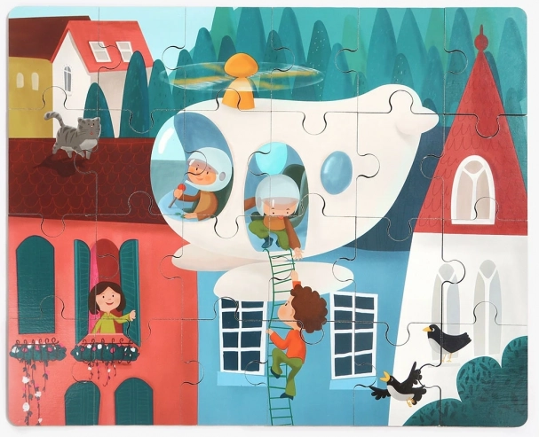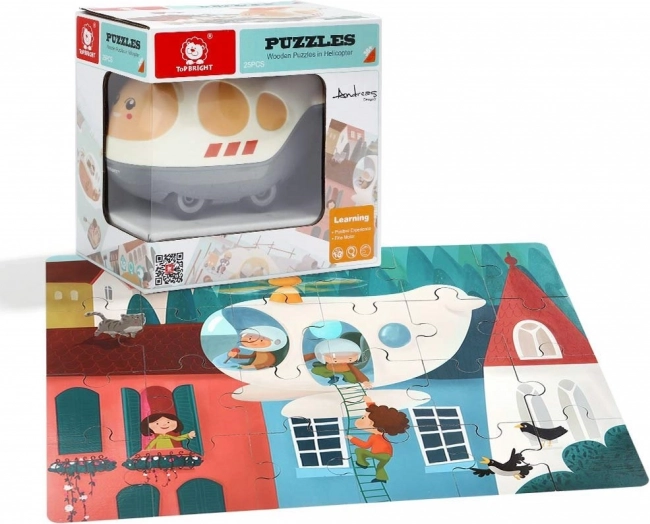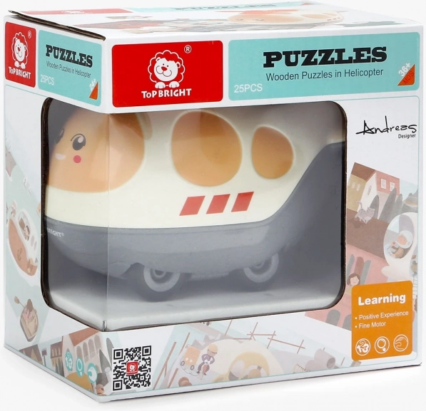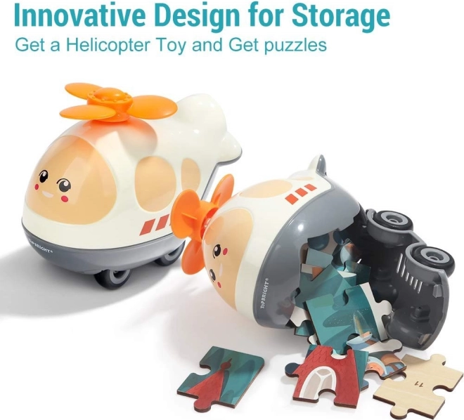 Sjov og smart kombination: træpuslespil med 24 brikker gemt i en sød plasthelikopter på hjul. Brikkerne har tal på bagsiden for lettere samling og udvikling af logisk og matematisk tænkning. Legetøjet fungerer også som opbevaring til puslespillet og styrker finmotorik og fantasi.