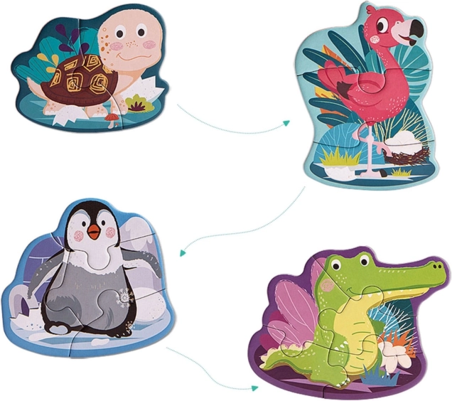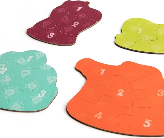 Fire puslespil med gradvist flere brikker styrker børns selvtillid og lærer dem at lægge puslespil trin for trin.