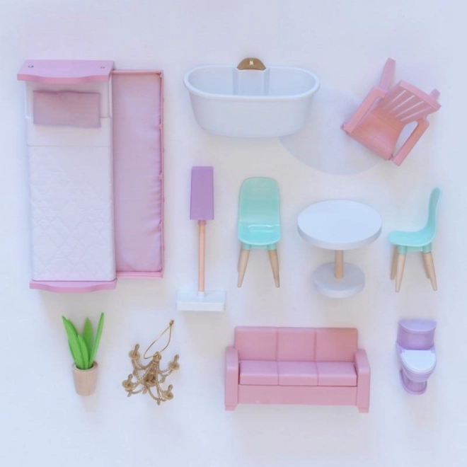 Med to etager, to værelser og et separat badeværelse tilbyder dukkehuset masser af plads til leg med dukker og tilbehør. De medfølgende 12 møbeldele gør det muligt at starte legen med det samme og ændre indretningen efter fantasien.