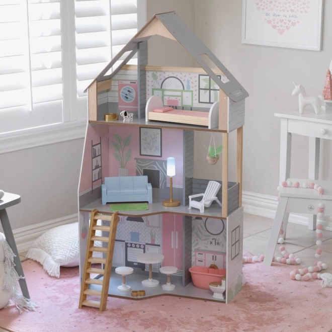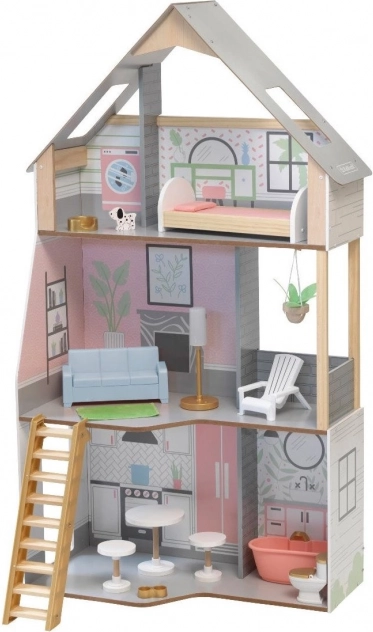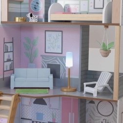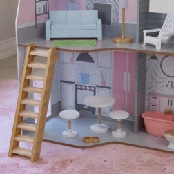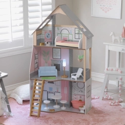 Det træbaserede KidKraft Alina dukkehus giver børn et realistisk miljø til at udvikle fantasien. Tre gennemtænkte etager omfatter et rummeligt køkken med spiseplads, stue med veranda, hyggelig kvist med soveværelse og et andet badeværelse. Takket være den slanke grundplan passer det perfekt selv i mindre børneværelser.