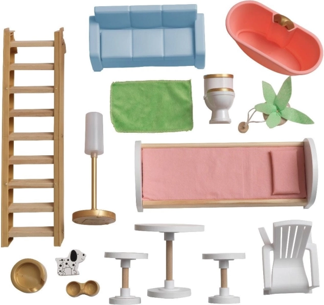 Pakken indeholder 15 stykker farverigt møblement og tilbehør, så børn straks kan indrette hvert rum efter deres ønsker. Den kvalitetsprægede kombination af træ og holdbar plast garanterer lang levetid og sikker leg fra 3 år.