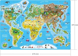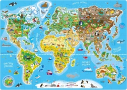 Verdenskort som sjov læring – børnepuslespil med illustrationer af seværdigheder (Eiffeltårnet, pyramiderne, Frihedsgudinden), naturens vidundere og typiske dyr fra de enkelte områder. Perfekt til hyggestunder sammen eller leg alene, der styrker geografisk orientering, ordforråd og logisk tænkning.