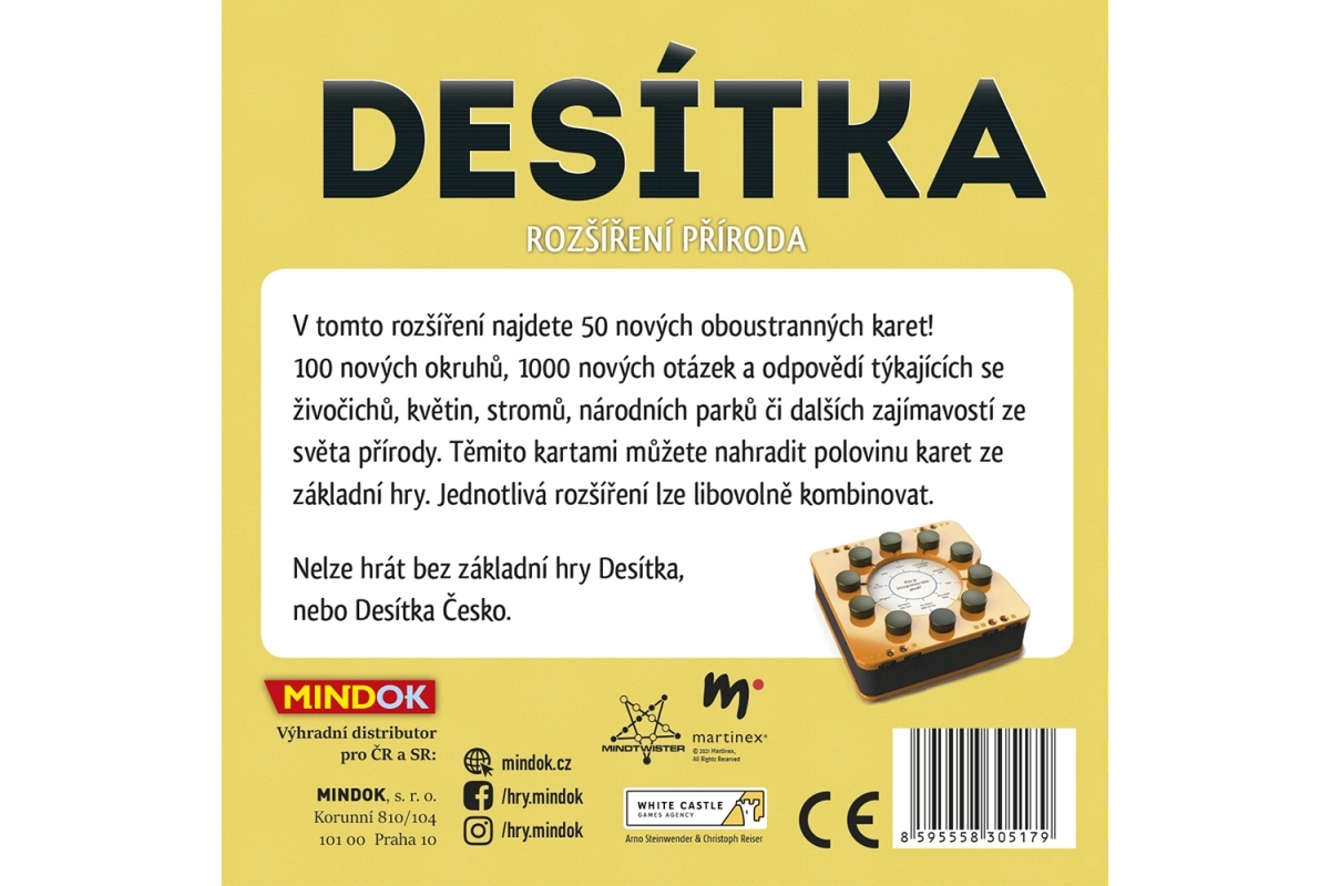 I denne udvidelse finder du 50 nye dobbeltsidede kort! 100 nye kategorier, 1000 nye spørgsmål og svar om lande, byer, seværdigheder, sprog og andre interessante fakta fra hele verden. Med disse kort kan du erstatte halvdelen af kortene fra grundspillet. De enkelte udvidelser kan kombineres frit. Pakken indeholder: 50 dobbeltsidede kort BEMÆRK: Dette er en udvidelse. Kan ikke spilles uden grundspillet Desítka eller Desítka Tjekkiet. Velegnet til børn fra 12 år.