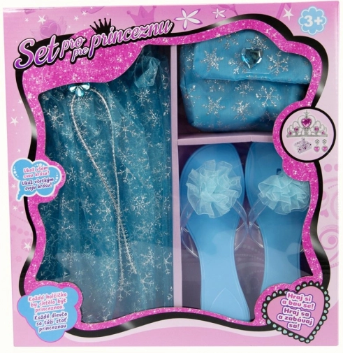 Forvandl legen til et eventyr med et blåt prinsessesæt, som indeholder en nederdel, små sko og en håndtaske. Ideelt til prinsesseleg, fastelavn og udklædning derhjemme.