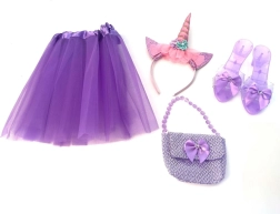 Opfyld enhver lille prinsesses drøm med dette komplette sæt til udklædning – indeholder sko, håndtaske, skørt og hårbøjle, ideelt til rolleleg og at styrke fantasien.