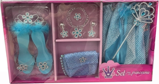 Opfyld enhver lille prinsesses drøm med dette prinsessesæt i blå. Sættet indeholder skørt, små tøfler, krone, håndtaske, tryllestav og smykker – alt hvad der skal til for en magisk prinsesseleg.