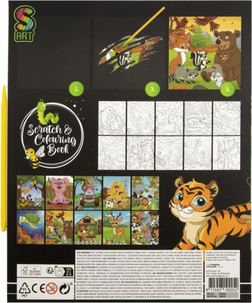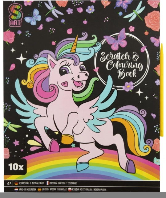 Opdag kreativ sjov for små kunstnere: ridse- og farvelægningssæt med 10 dobbeltsidede ark og plastikpen. Hvert ark har en ridseside på den ene side og en farvelægningsside på den anden. Forskellige motiver, ideelt til børn 4+ , billedstørrelse 21×26 cm.