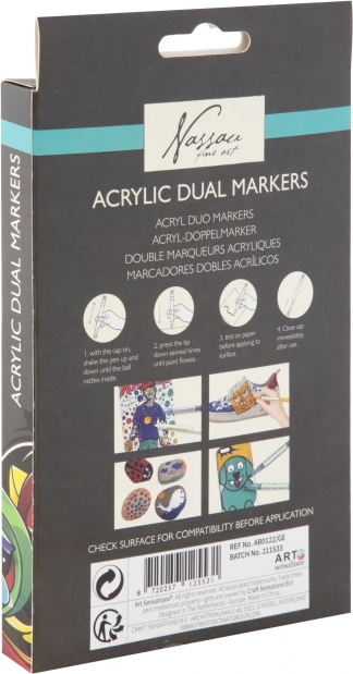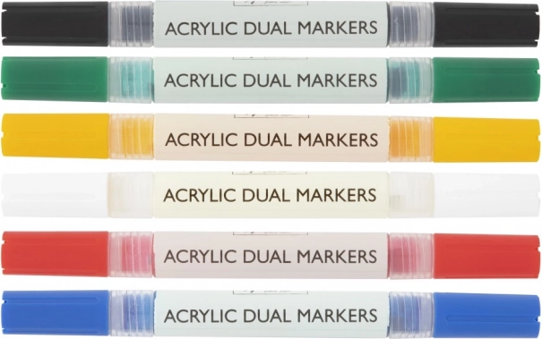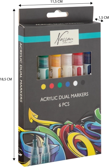 Dette praktiske sæt af dobbeltendede akryltuscher giver livlige, dækkende nuancer og bekvemmeligheden ved to spidser i hver tusch. Skab skilte, illustrationer, dekorationer og DIY-projekter – fra papir og karton til udsmykning af sten, træ eller sko.