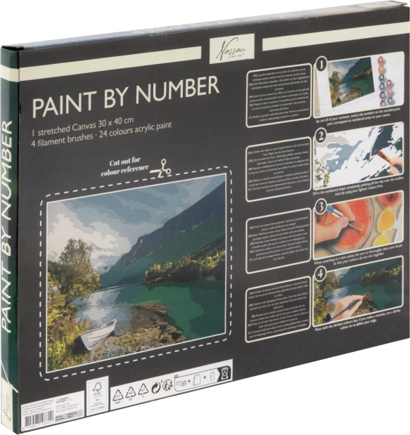 I pakken finder du et opspændt lærred 30 × 40 cm med fortrykte tal, 24 akrylfarver og 4 pensler (2 flade, 2 runde) – uden behov for ekstra tilkøb.