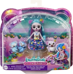 Oplev en fantasyverden med Enchantimals koala familie Joette. Dette sæt er en del af Glam Party kollektionen, hvor alle skovens venner oplever utrolige eventyr sammen med deres kæledyr. Dukken Johana måler 15 cm og har langt blåt hår med lyserøde striber, fremtrædende ører og en gul blomst på hovedet. Hun er klædt i en original top og en blå nederdel, bærer blå sko og hendes lemmer er bevægelige.