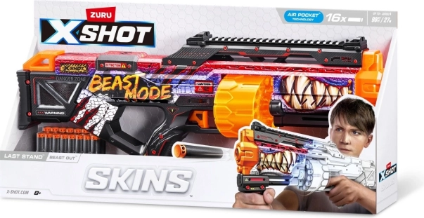X-Shot Skins Last Stand Beast Mode er en kraftig skumblaster til børn med roterende tromle til 14 pile, rækkevidde op til 27 m og en pakke med 16 pile med Air Pocket-teknologi. Takket være den taktiske greb og ladeskinne er den nem at betjene, mens det markante Skins-design Beast Mode sikrer stil i hver kamp.