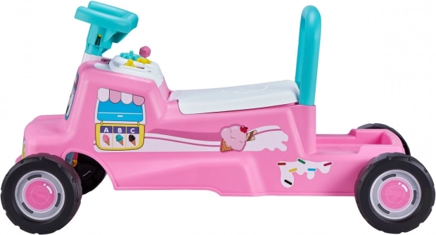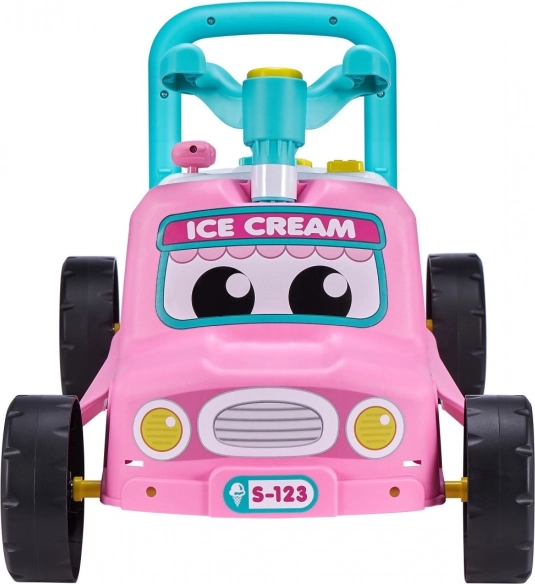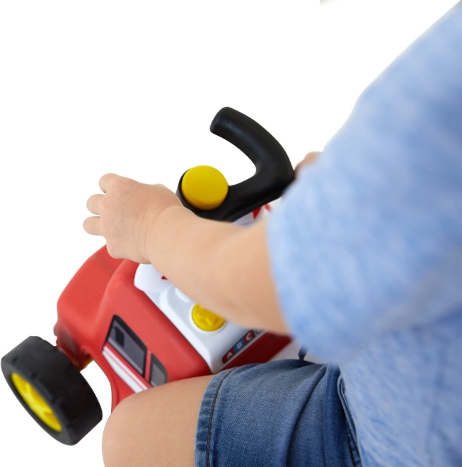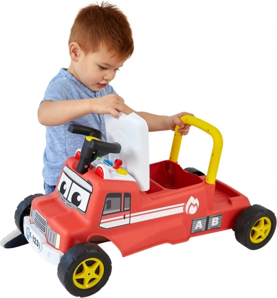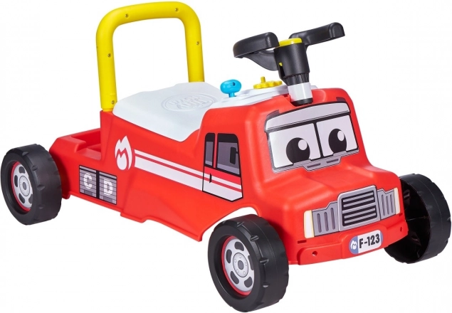 Det praktiske opbevaringsrum under sædet rummer små legetøj eller skatte fra gåturen. Hornet på rattet tilføjer sjove effekter, og det bageste håndtag fungerer som støtte ved de første skridt. Løbecyklen fås i 2 varianter (brandbil / isvogn), motiv sendes tilfældigt.