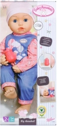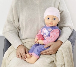 Dukken er klædt i en yndig sparkedragt med fåretryk og en lyserød hue. En sutteflaske til fodringsleg er inkluderet. Takket være standardstørrelsen kan man også bruge rigtigt babytøj, så omklædning og kombination af outfits er en leg.