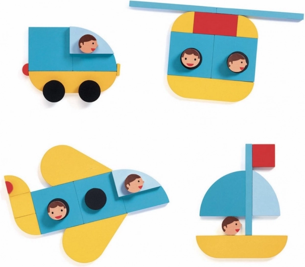 Hver puslespil indeholder skabeloner af forskellige køretøjer som biler, helikoptere eller raketter, der nemt kan samles med magnetiske brikker.