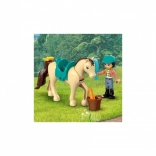 Dette farverige sæt er ideelt til små byggere fra 4 år. Takket være Startklodsen går byggeriet hurtigt og nemt, så børnene hurtigt kan lege med trækkende bil og trailer, to minidukker og to heste. I skoven venter en væltet træstamme som springforhindring samt masser af udstyr til hestepleje.