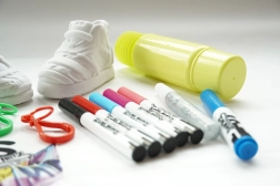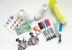 - Komplet kreativt sæt: sneakers, tuscher, glitter, klistermærker, vedhæng og samleliste.
