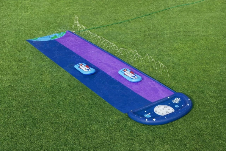 To parallelle baner indbyder til kapløb, mens de oppustelige bobslæder med raketmotiv giver ekstra fart og komfort ved hver tur. Det slidstærke PVC-materiale og den bløde glideflade bidrager til komfort og længere levetid. Ideel til børnefødselsdage og daglig afkøling på varme dage.
