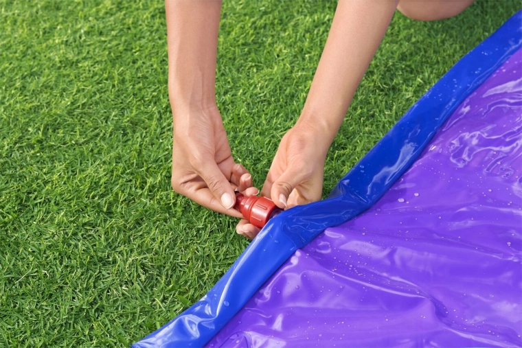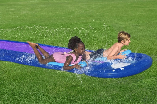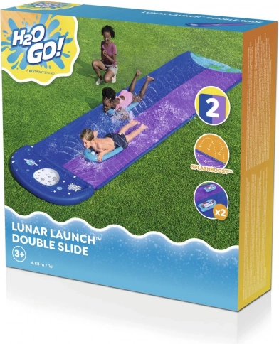 Denne lange dobbelte skøjtevandbane BESTWAY H2O GO! giver børn hurtig, sikker og forfriskende sommerunderholdning direkte i din have. Det er nok at rulle den ud, fastgøre med pløkker og tilslutte haveslangen – sprinklere på siderne holder overfladen konstant våd for en glat glidebane.
