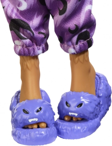 Clawdeen Wolf kommer i et perfekt koordineret “creep-chic” look, der kombinerer komfort og uhyggeligt nuttet stil. Lange lilla bølgede lokker, en blød, lodden jakke, crop top og leggings med månedeprint skaber et outfit, som børn vil elske. Takket være bevægelige led i talje, albuer, håndled og knæ kan hun nemt indtage stjernepositurer.