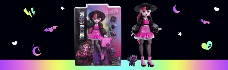 Draculaura imponerer med et detaljeret outfit i pink og sort, som understreger hendes ikoniske, let gotiske look. Sættet kompletteres af tematiske småting og et trofast kæledyr, som gør det let for børn at finde på masser af historier. Takket være leddene kan dukken nemt poseres til leg og udstilling.