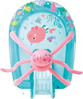 Det oppustelige vandlegecenter Blæksprutte forvandler din have til et lille havkongedømme. Takket være den integrerede sprøjte, der tilsluttes haveslangen, skaber det en fin vandeffekt, som børn elsker, og rutsjebanen fuldender sjoven med sikker glidning ned i bassinet. Den ekstra oppustelige bund øger komforten ved både at sidde og lege.