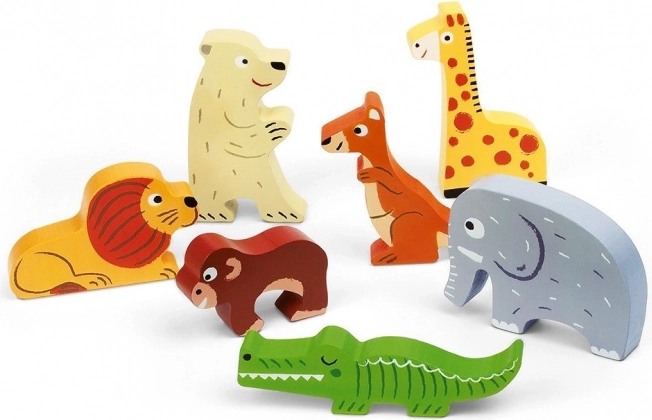 Dette smukt illustrerede træpuslespil giver børn glæde ved at opdage og lære. Syv zoo-dyr – for eksempel elefant, løve og krokodille – har matchende farver på pladen, hvilket hjælper børn med lettere at forstå forholdet mellem form og farve.