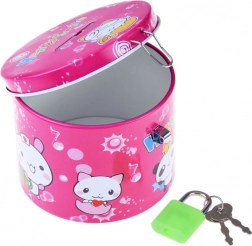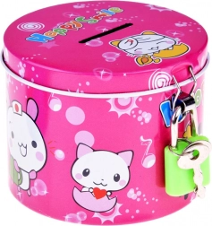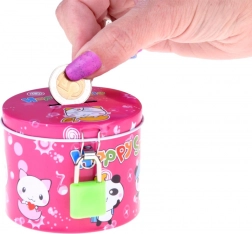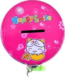 En sød rosa sparebøsse i metal med dyremotiver og teksten Happy Smile, som hjælper både børn og voksne med at opbygge en sparevane. Den har en øverste sprække til mønter og sikker lukning med hængelås samt to nøgler, så opsparingen forbliver tryg.