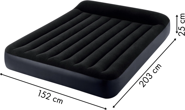 Dobbeltlaget oppustelig madras fra INTEX i målene 203 × 152 × 25 cm giver behagelig søvn til 2 personer både hjemme og på farten. Den er fremstillet af slidstærk PVC, overfladen er behagelig vandafvisende velour, og takket være den indbyggede elektriske pumpe kan den pustes op på cirka 250 sekunder. Den stabile konstruktion med Dura-Beam Fiber-teknologi sikrer fremragende støtte til rygsøjlen, mens den integrerede pude giver ekstra komfort. En praktisk ventil muliggør hurtig tømning og nem opbevaring.